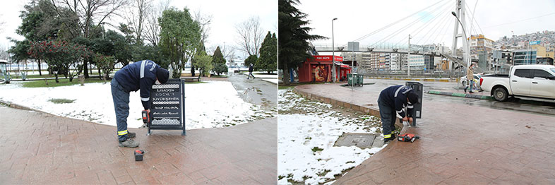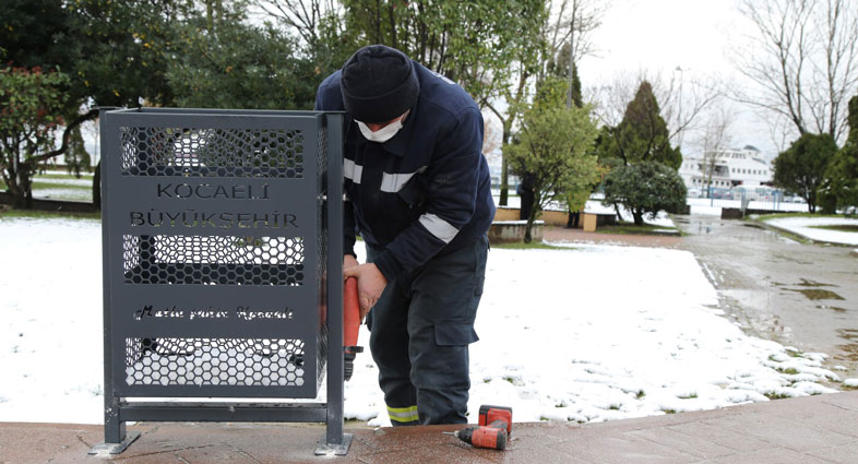 Kocaeli Büyükşehir Belediyesi Park, Bahçe ve Yeşil Alanlar Daire Başkanlığı, İzmit’te yeni çöp kovalarının montajını yapıyor