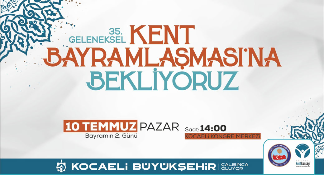 Kocaeli Büyükşehir Belediyesi 35. Geleneksel Kent Bayramlaşmasını Kurban Bayramı’nın ikinci günü 10 Temmuz Pazar günü yapılacak. Kocaeli Valiliği, Kocaeli Büyükşehir Belediyesi ve Kocaeli Kent Konseyi'nin düzenlediği “35. Kocaeli Kent Bayramlaşması” Kurban Bayramı’nın ikinci gününde Kocaeli Kongre Merkezi’nde saat 14.00’te gerçekleşecek.