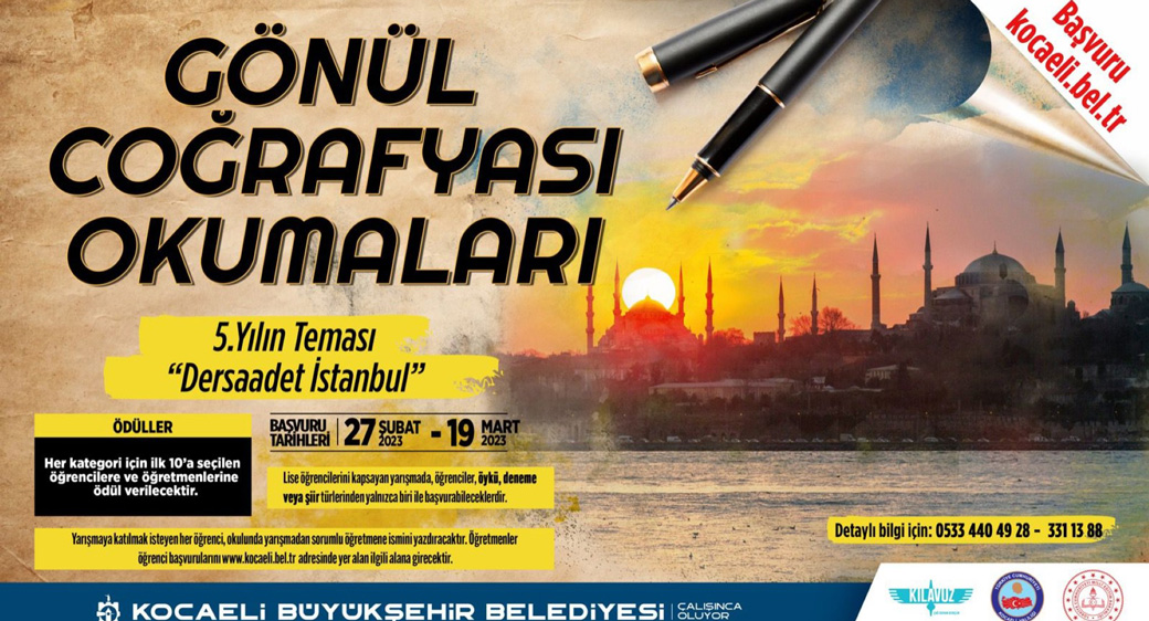 Gençlik ve Spor Hizmetleri Dairesi Başkanlığı Gençlik Eğitimi Şube Müdürlüğü ve İl Milli Eğitim Müdürlüğü iş birliğinde; bu yıl beşinci kez Kocaeli genelinde eğitim alan lise öğrencilerine yönelik “Dersaadet İstanbul” temalı “Gönül Coğrafyası Okumaları” yarışması düzenleniyor.