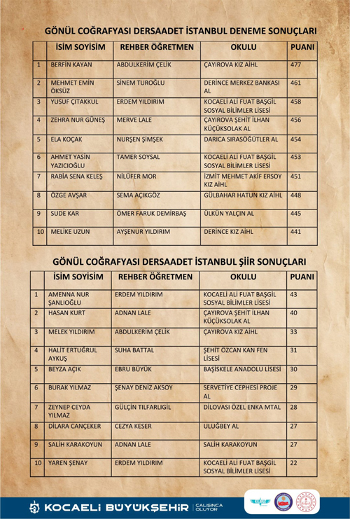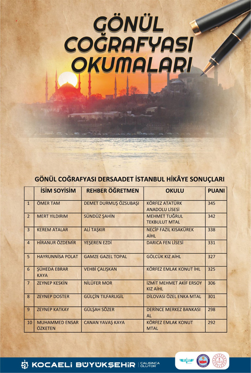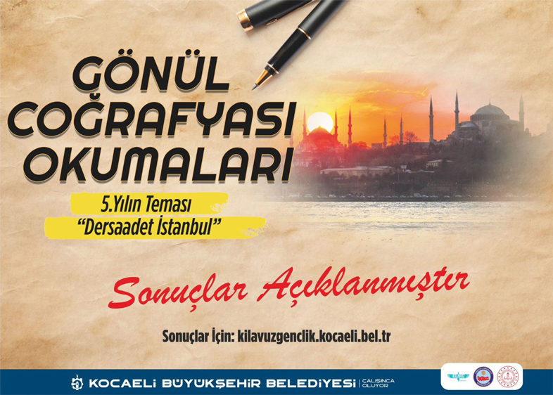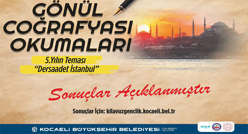 Kocaeli Büyükşehir Belediyesi tarafından her yıl geleneksel olarak düzenlenen ve bu yıl beşincisi gerçekleştirilen ‘Dersaadet İstanbul’ temalı “Gönül Coğrafyası Okumaları” yarışmasının sonuçları açıklandı. Büyükşehir, örnek şehircilik hizmetlerinin yanı sıra kültür ve sanat faaliyetleri kapsamında önemli çalışmalar yapıyor. Geleneksel hale gelen ve beşincisi düzenlenen “Gönül Coğrafyası Okumaları”, kültür, sanat ve edebiyat alanında dikkat çekiyor. Yarışmanın bu yılki kazananları da açıklandı.