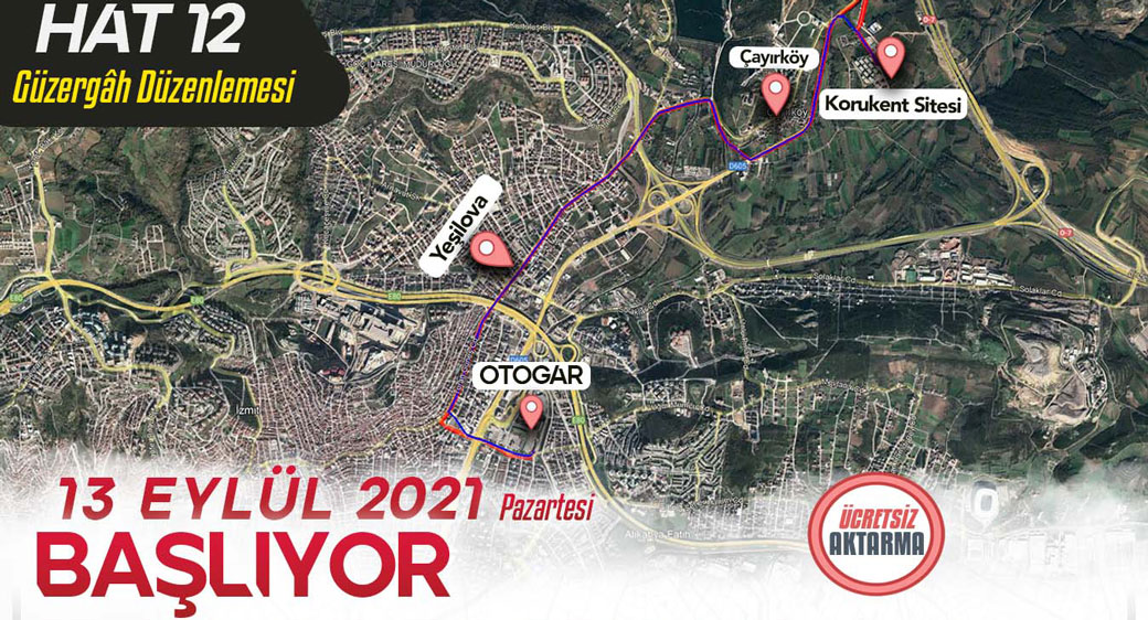 12 No’lu hat güzergahında yapılan düzenleme ile Korukent’ten çıkan araç D-605, Çayırköy Sokak, Turan Güneş Caddesi, Yeşilova, Kireç Ocakları, Seymen Sapağı, Feyzullah İzmidi Caddesini takip ederek otogara ulaşacak. Vatandaşlar Otogar istasyonundan ücretsiz olarak aktarma yapabilecek. Buradan isteyen vatandaşlar tramvaya veya 26, 28 ve 29T No’lu hatlara ücretsiz binebilecek.