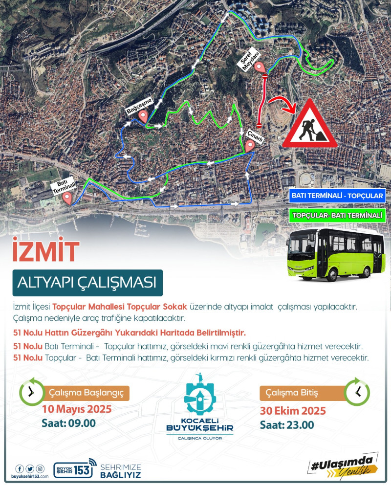 Büyükşehir, İzmit Cedit Mahallesi Topçular Sokak’ta başlatılacak altyapı çalışması dolayısıyla 51 ve 53 no’lu hatlarda güzergah değişikliği yapılacağını duyurdu