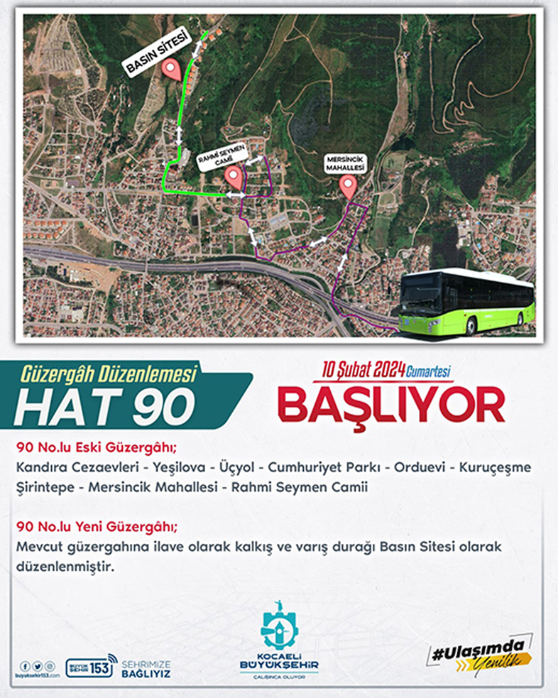 Kocaeli Büyükşehir Belediyesi 90 No’lu hatta yeni düzenleme yaparak kalkış ve varış noktasını Basın Sitesi olarak güncelledi