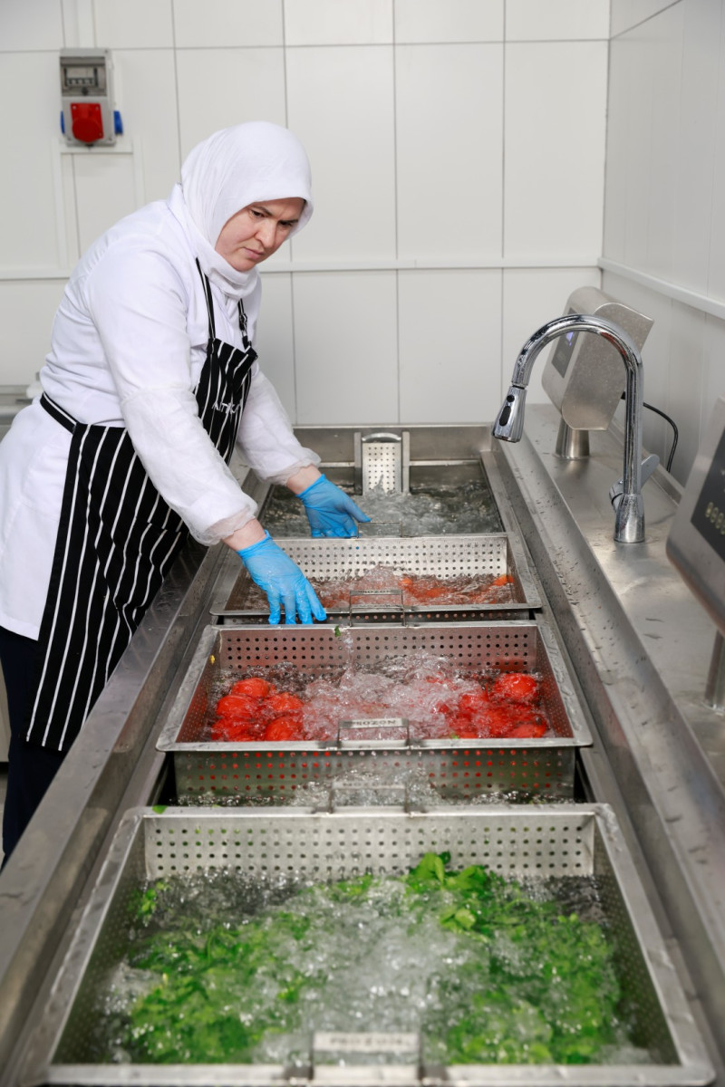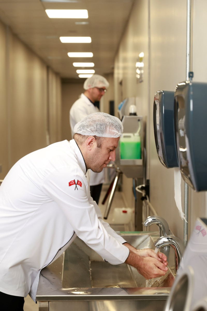 Üretim alanına giriş yapan personel; ayak tabanı dezenfeksiyonu, otomatik el dezenfektanı, turnike kontrollü geçiş ve koruyucu ekipman zorunluluğu gibi sıkı prosedürlerden geçiyor. Sebzeler ozonlu suyla yıkama makinelerinde işlenerek bakteri, virüs ve tarım ilacı kalıntılarından arındırılıyor. Kimyasal temizlik maddeleri yalnızca bakanlık onaylı ürünlerden seçilirken, tüm ekipmanlar renk kodu sistemiyle ayrılarak çapraz bulaşma tamamen engelleniyor. Bu uygulamalar, Hızır 41’in gıda güvenliğini en üst düzeyde sağlamasını mümkün kılıyor.