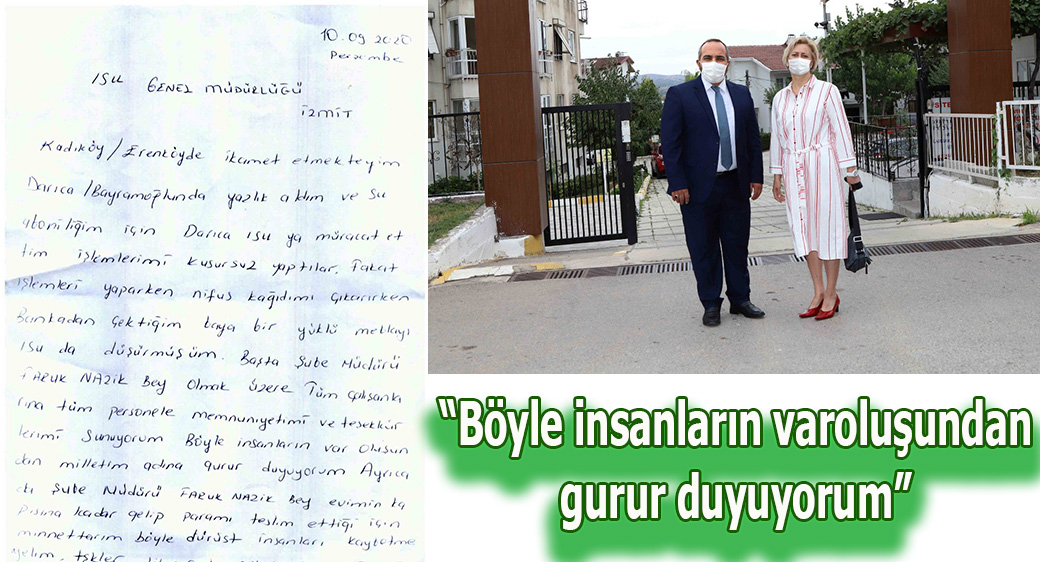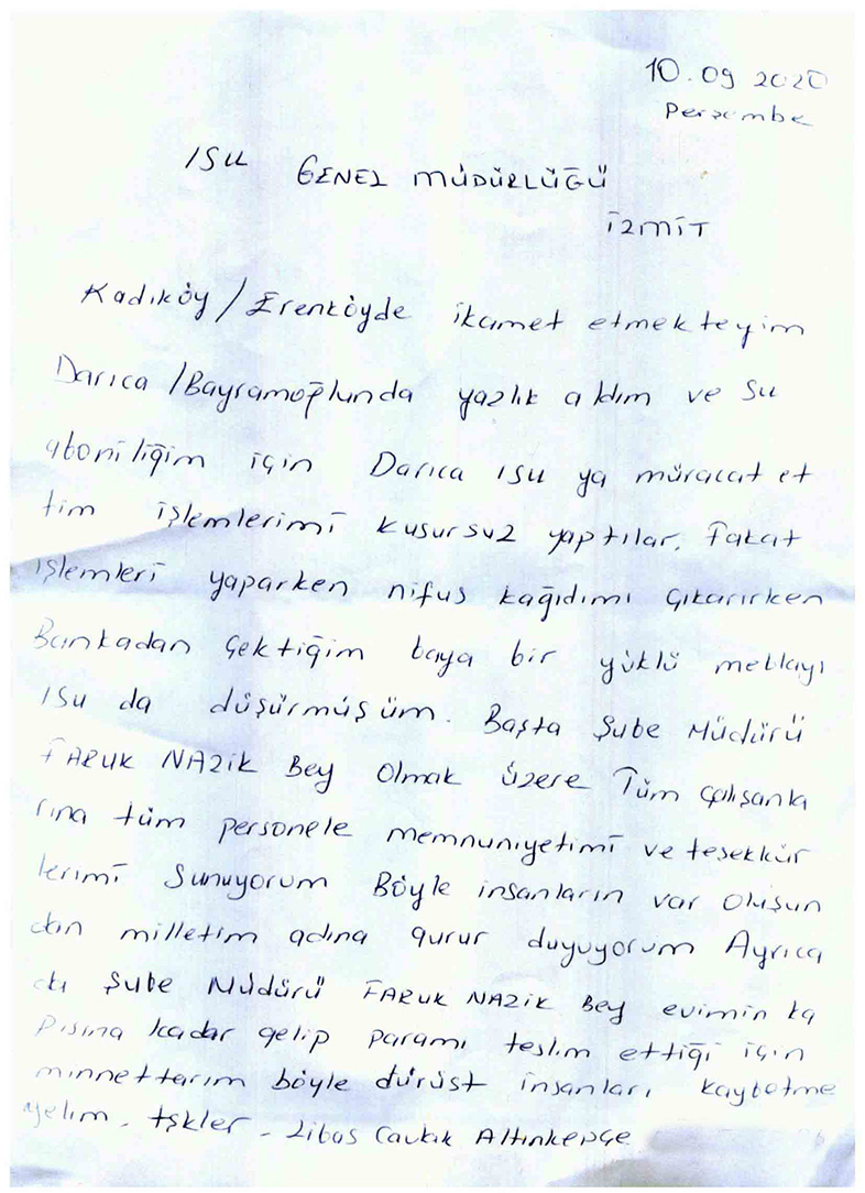 Kocaeli’nin Darıca ilçesi Bayramoğlu Mahallesi’nde aldığı konutun su aboneliğini yaptırmak için İSU Darıca Şube Müdürlüğü’ne giden ve işlemler sırasında yüklü miktarda parasını düşüren Libas Cavlak Altınkepçe’ye parası teslim edildi. İSU Darıca Şube Müdürü Faruk Nazik’ten parasını teslim alan Altınkepçe, kuruma teşekkür mektubu göndererek; ”Böyle insanların var oluşundan dolayı milletim adına gurur duyuyorum” dedi.