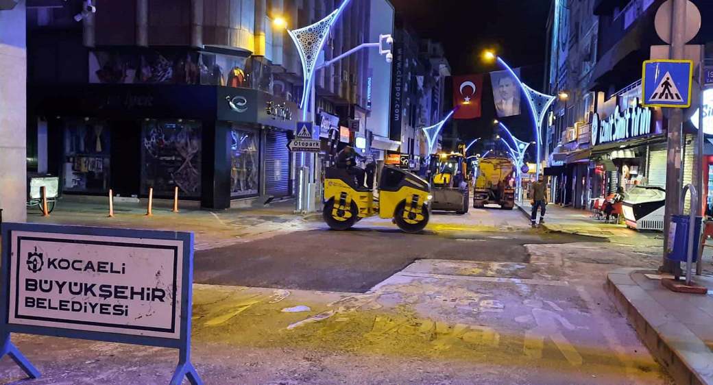 Büyükşehir Yol Bakım Timi, yaya ve araç trafiğini aksatmamak için çalışmalarını gece geç saatlerde yapıyor. Ekipler, İzmit Alemdar Caddesi’ni asfaltladı