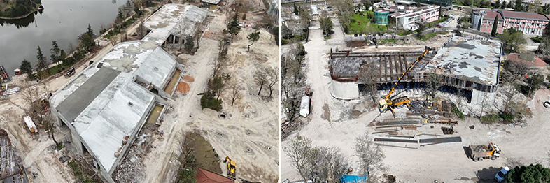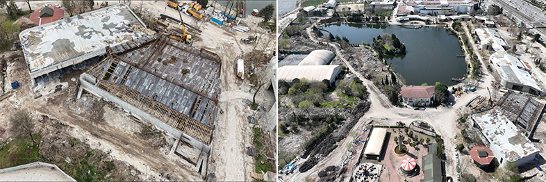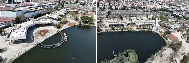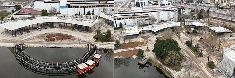 Eski ve kullanışsız yapıların kaldırıldığı alanda vatandaşların kullanımı için yenilerinin yapımı devam ediyor. Bu kapsamda kafeler bölgesinde cam montajında sona gelindi. Prekast dış cephe imalatları devam ediyor. Ekipler yapılan iç kısımlarında ise zemin döşeme imalat hazırlıklarına başladı.
