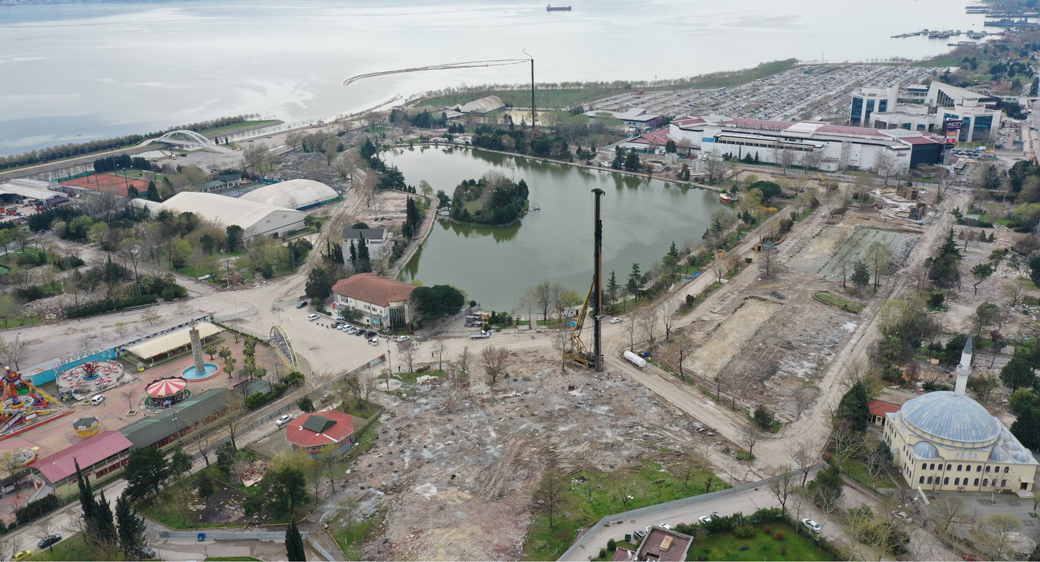Kocaeli Fuarı alanı Büyükşehir Belediyesi’nce İzmit Millet Bahçesine dönüştürülüyor. Eski yapıların yıkıldığı Kocaeli Fuarı’nda zemin güçlendirilmesi için fore kazık imalatları yapıldı. Düğün salonlarında fore kazık imalatları tamamlandı. Kazıkların aralarının kazı işlemleri devam ediyor. Su deposu bölgesinde de fore kazık imalatlarına sürüyor.