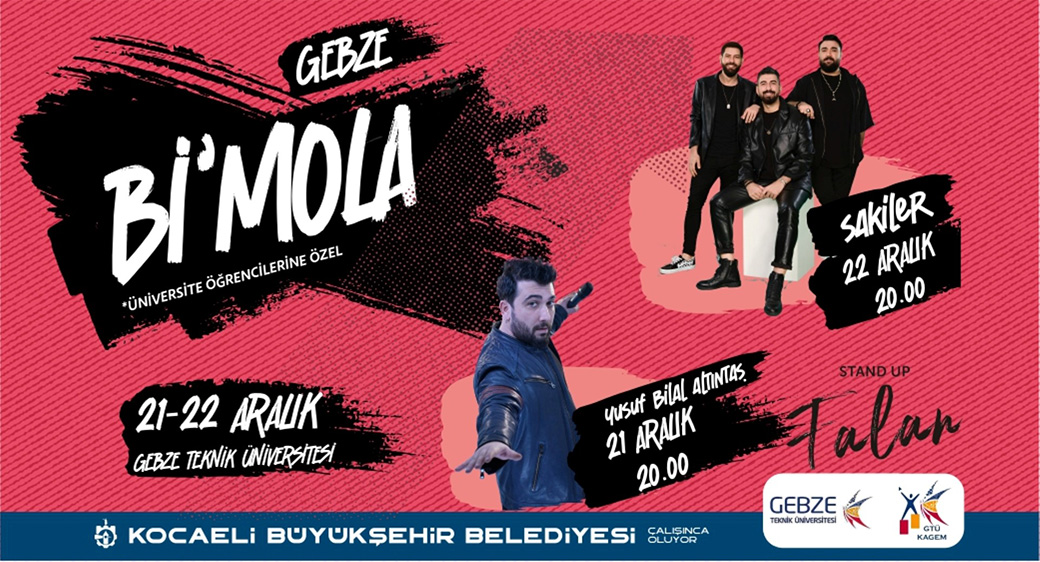 Gençlik ve Spor Hizmetleri Dairesi Başkanlığı Gençlik Hizmetleri Şube Müdürlüğü, Gebze Teknik Üniversite öğrencilerinin 2022-2023 Eğitim-Öğretim Yılı Bahar Yarıyılı final sınavlarına moralle girmelerini sağlamak amacıyla etkinlik düzenliyor. 21-22 Aralık 2022 tarihlerinde Gebze Teknik Üniversitesi’nde stand-up gösterisi ve konser etkinliğini içeren organizasyonlar iki gün boyunca kültür ve sanat rüzgârı estirecek. Kampüste Bi'Mola adlı geleneksel etkinlik 21 Aralık 2022 Çarşamba günü saat 20.00’de Yusuf Bilal Altıntaş stand-up gösterisiyle başlayacak. 22 Aralık 2022 Perşembe günü saat 20.00’de ise Hasan Gözetlik, Yücel Girgin ve Serkan Balkan'dan oluşan başarılı müzik grubu Sakiler, sevilen şarkılarını seslendirerek, Gebze Teknik Üniversitesi öğrencilerine unutulmaz bir gece yaşatacak.