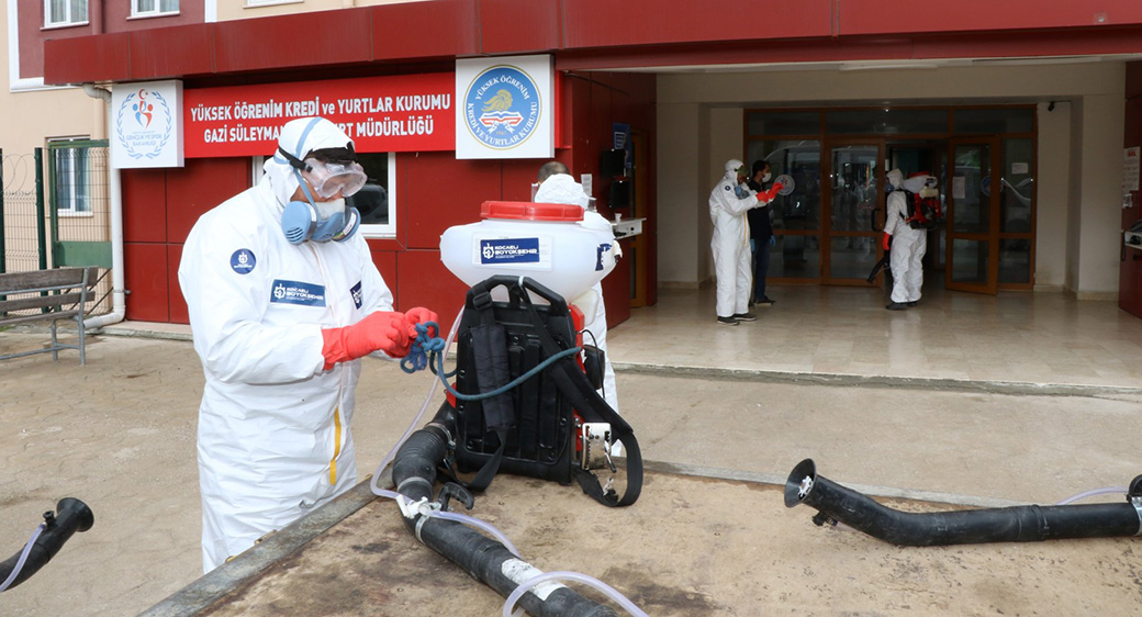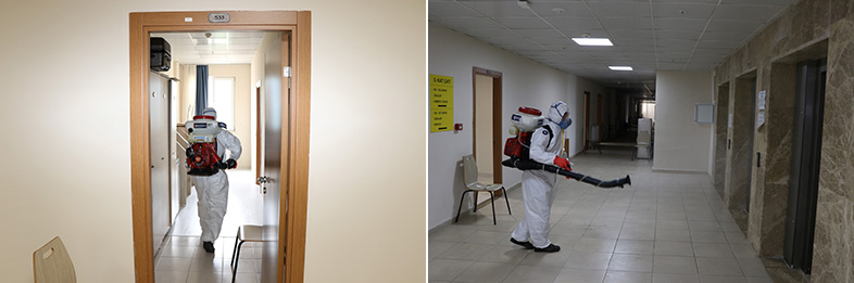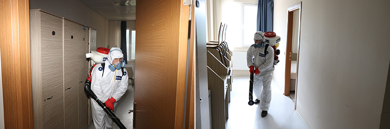 Yurt dışından gelen vatandaşların, karantina süresince kalacakları öğrenci yurtları Büyükşehir Belediyesi Sağlık ve Sosyal Hizmetler Dairesi Başkanlığı’na bağlı çalışan ekipler tarafından dezenfekte uygulaması ile temizleniyor. Vatandaşlar yurtlarda gönül rahatlığı ile 14 gün ayrı odalarda kalıyor. 14 günün sonunda da eğer vatandaşlar da bir sorun yok ise evlerine uğurlanırken yeni misafirler için odalar hazırlanıyor. Bu kapsamda yurttaki masa, pencere kulpları, kapı, koridor, tuvalet ve diğer tüm mekanlar baştan aşağıya dezenfekte edilerek temizleniyor.