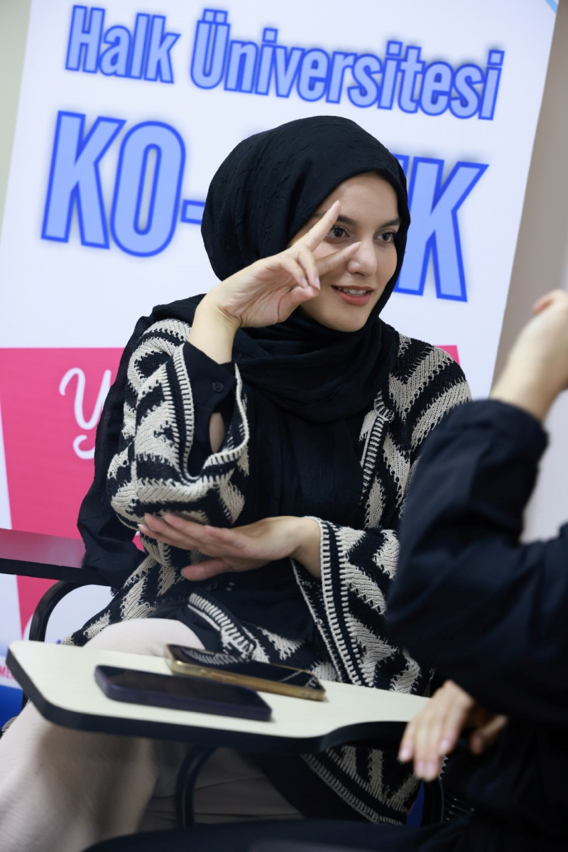 Neden işaret dili öğrenmek istediklerini anlatan 57 yaşındaki Birsen Birinci, “Oğlumun nişan merasiminde işitme engelli olan dünürlerimizle iletişim kurabilmek için bu kursa yazıldık. İşaret dili hiç bilmediğimiz bir konuydu, internetten birkaç işaret öğrendik ama bu yeterli değildi. KO-MEK’e yazılınca burada temel işaretleri öğrenme şansımız oldu. Birkaç gün önce dünürümün doğum günüydü. İşaret diliyle doğum gününü kutlamam gelinimin ve ailesinin çok hoşuna gitti bizde çok mutlu olduk” diyerek mutluluğunu dile getirdi.