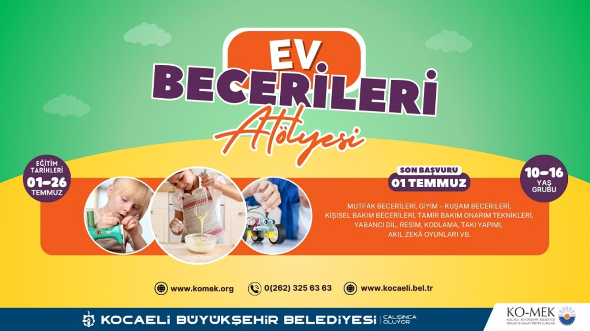 Kocaeli Büyükşehir Belediyesi Meslek ve Sanat Eğitim Kursları (KO-MEK) geçtiğimiz dönem yaz tatilinde olduğu gibi bu yaz döneminde de ev becerileri kursunu hayata geçiriyor. Özellikle Kocaeli gençliğinin sosyal ve kültürel gelişimine katkı sunmayı hedefleyen KO-MEK, eğitimin günlük hayatta da sürdürülebilmesi amacıyla farklı branşlarda Ev Becerileri Atölyesi açıyor. Ücretsiz olarak faaliyetlerini gerçekleştirecek olan atölyelerde gençlere, Mutfak Becerileri, Giyim – Kuşam Becerileri, Kişisel Bakım Becerileri, Tamir Bakım Onarım Teknikleri, Yabancı Dil, Müzik Dinletisi, Resim, Kodlama, Takı Yapımı (Anahtarlık, Kolye, Bileklik ) Geri Dönüşüm, Akıl Zekâ Oyunları vb. branşlarında eğitimler verilecek.
