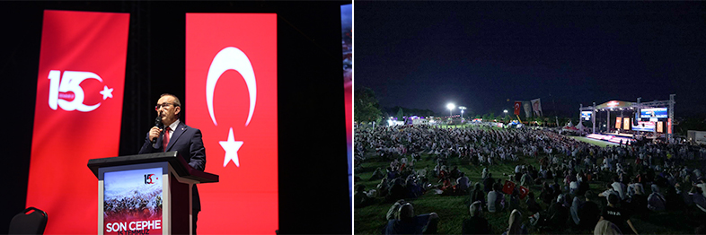 Öte yandan dolu dolu içeriğiyle dikkat çeken program akşam namazının cemaatle birlikte alanda kılınmasıyla başladı. Açılış, saygı duruşu ve İstiklal Marşı’nın okunmasını protokol konuşmaları takip etti. Ardından Cumhurbaşkanı Recep Tayyip Erdoğan, 15 Temmuz Demokrasi ve Milli Birlik Günü münasebetiyle Millete Sesleniş konuşması gerçekleştirildi.