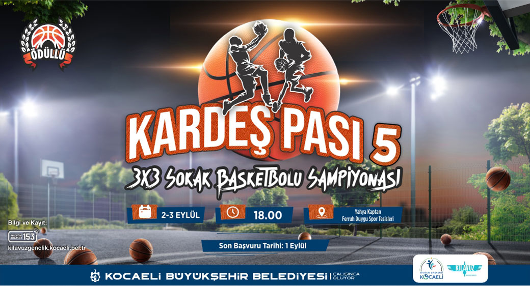 “Sporun Başkenti Kocaeli” vizyonuna uygun olarak yerel, ulusal ve uluslararası organizasyonlar gerçekleştiren Kocaeli Büyükşehir Belediyesi, bu yıl beşincisini düzenlediği Kardeş Pası Sokak Basketbol Şampiyonası’nda basketbol severleri bir araya getirecek. Turnuvaya başvurular 1 Eylül Cuma günü (bugün) mesai bitimine kadar Kocaeli Büyükşehir Belediyesi https://kilavuzgenclik.kocaeli.bel.tr/ sitesinden online olarak yapılabilecek.