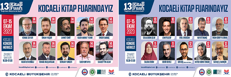 Bu iki tematik programın yanı sıra Kocaeli Kitap Fuarı’nda 750’den fazla söyleşi ve imza günü de gerçekleşecek. İlber Ortaylı, Ahmet Ümit, Saliha Erdim, Sevil Atasoy, Nurullah Genç, Ender Saraç, Mim Kemal Öke, Hande Fırat- Zafer Şahin, İhsan Süreyya Sırma, Ziya Selçuk, Hakan Çelik söyleşi ve imza günü düzenleyecek yazarlardan sadece bazıları… 13. Kocaeli Kitap Fuarı’na katılacak yazarların söyleşi ve imza günleri www.kocaelikitapfuari.com adresinden takip edilebilir.