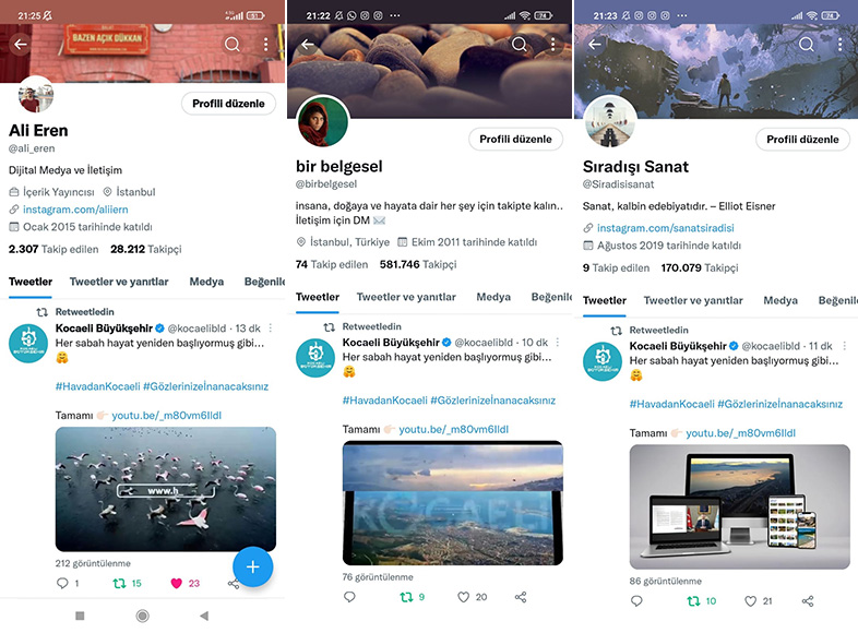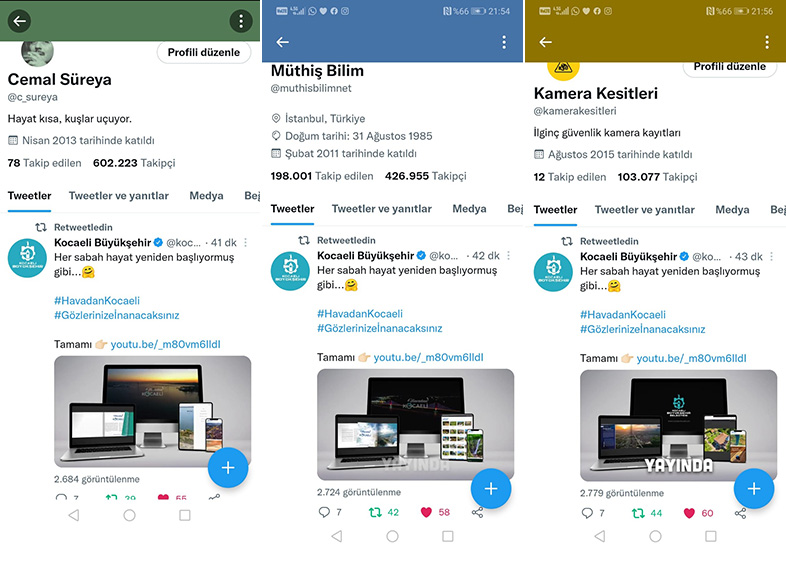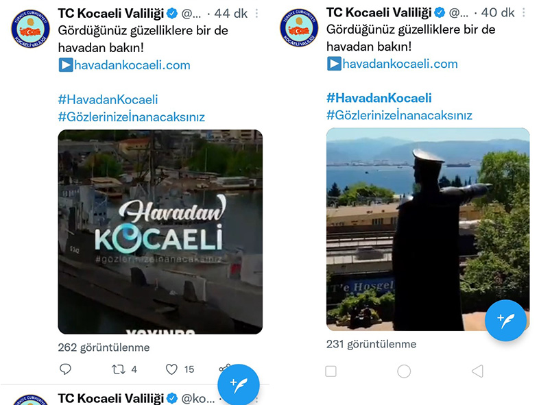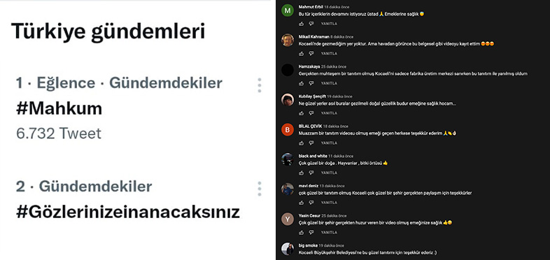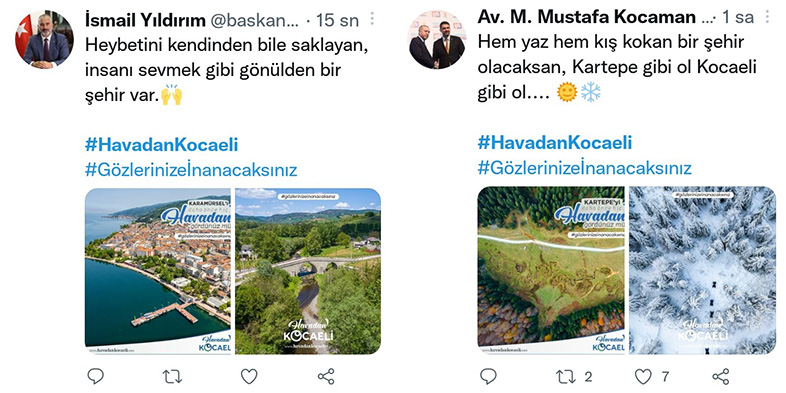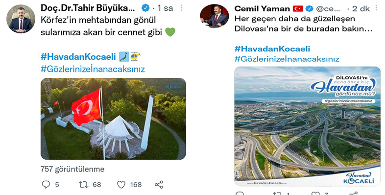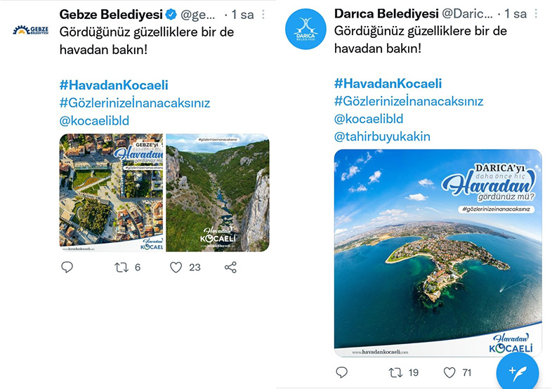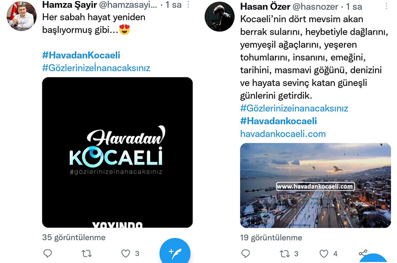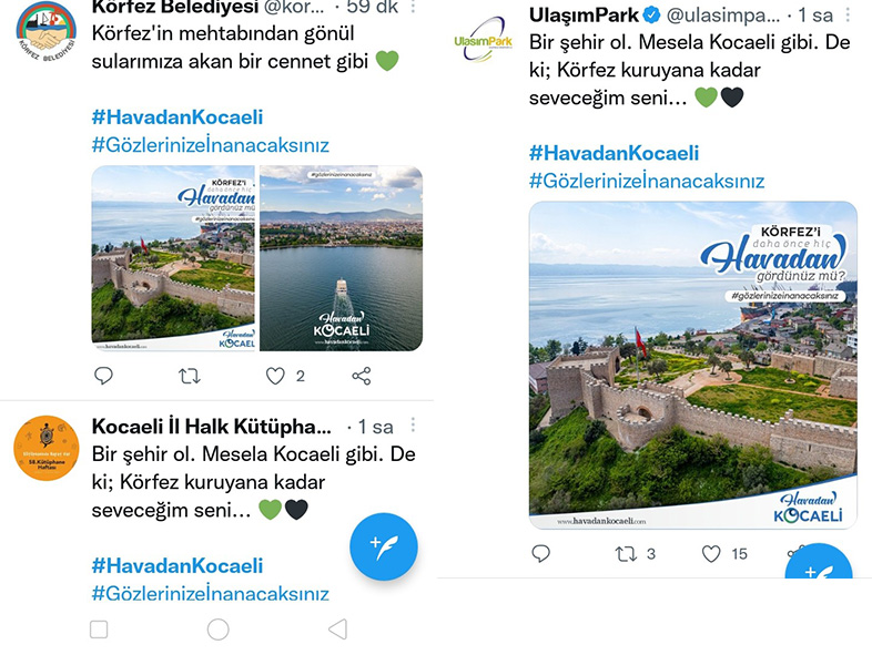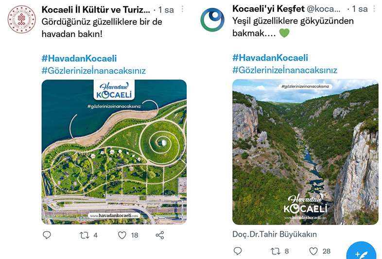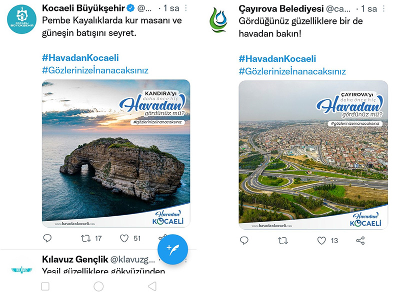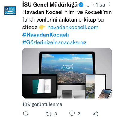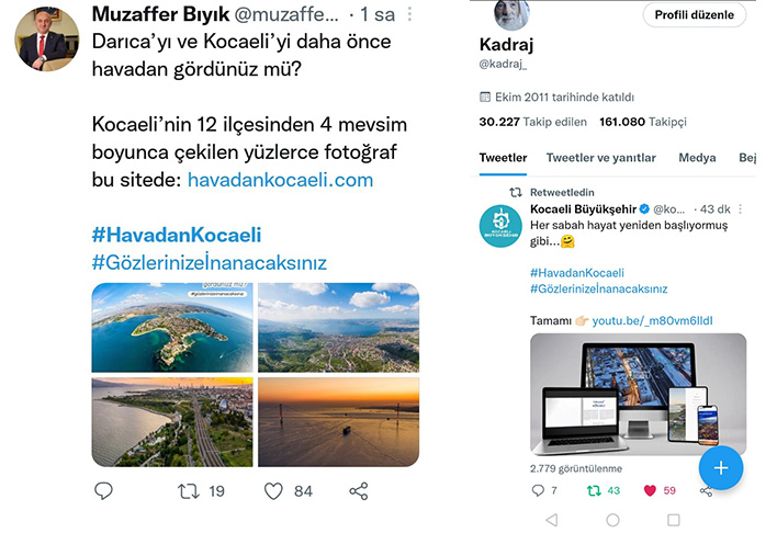 Öte yandan www.havadankocaeli.com internet sitesi yayına başladığı andan itibaren yoğun ilgi gördü. Sitenin yayına başlamasıyla beraber eş zamanlı olarak Büyükşehir’in sosyal medya hesaplarından da #gözlerinizeinanacaksınız ve #havadankocaeli etiketleriyle paylaşılan yeni tanıtım filmi ve fotoğraflar, Büyükşehir’e bağlı kuruluşlar, Kocaeli Valiliği, milletvekilleri, belediyeler, belediye başkanları, Kocaelili vatandaşlar ve doğa tutkunu sosyal medya fenomenleri tarafından paylaşıldı. Herkesin hayranlıkla izlediği Kocaeli’nin yeni tanıtım filmi ve internet sitesine olan yoğun ilginin ardından Kocaeli, yapılan paylaşımlarla Türkiye gündeminde ikinci sıraya kadar yükseldi.