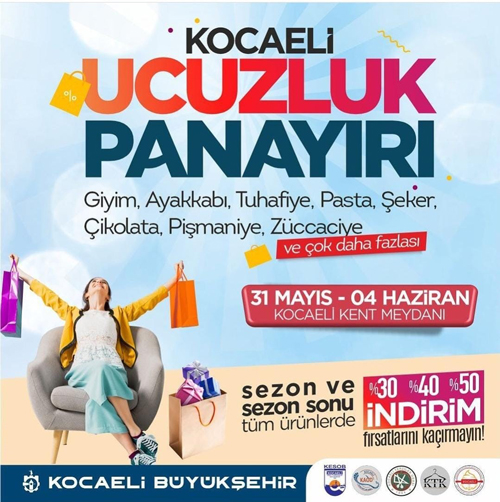 Kocaeli Büyükşehir Belediyesi’nin destekleriyle 31 Mayıs-04 Haziran tarihleri arasında Kocaeli Kent Meydanında “Kocaeli Ucuzluk Panayırı” kuruluyor. Panayır aynı zamanda sosyal sorumluluk çalışmalarını da içeriyor. Deprem bölgesinde ürünlerini satamayan esnafın ürünleri de panayırda yer alacak ve sağlanacak gelir deprem bölgesinde bulunan esnaf ile depremden etkilenen vatandaşlara gönderilecek. Kocaeli esnafının da yer aldığı panayırın şenlik havasında geçmesi için tüm çalışmalar yapılıyor.