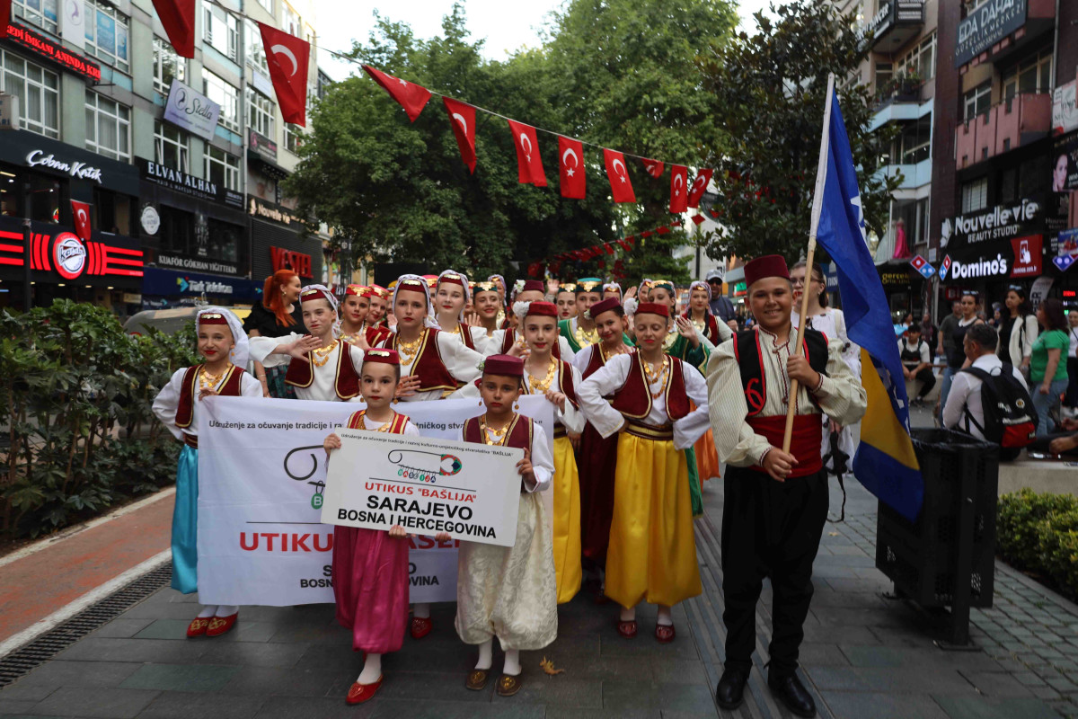Festivalin ilk adımı, İzmit Merkez Bankası mevkiinden başlayan ve Milli İrade Meydanı’na kadar süren kortej yürüyüşüyle atıldı. Yaklaşık 300 kişinin katıldığı yürüyüşte; Türkiye, Bosna Hersek, Kuzey Makedonya ve Sırbistan’dan gelen halk dansı ekipleri, geleneksel giysileri ve bayraklarıyla İzmit sokaklarını adeta bir şölene çevirdi. Renkli kostümleriyle ilgi gören ekipler, yol boyunca vatandaşların alkış ve tezahüratlarıyla karşılandı. Katılımcılar, taşıdıkları milli bayraklarla festivalin coşkusunu şehrin dört bir yanına yaydı.