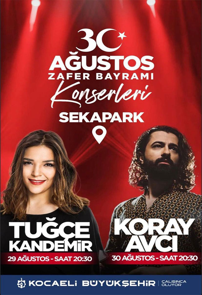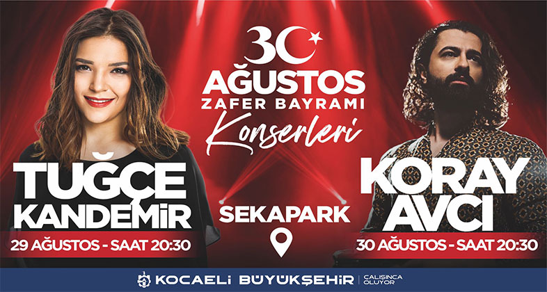 Kocaeli Büyükşehir Belediyesi, Türk Ulusunun bağımsızlık mücadelesindeki en önemli dönüm noktalarından biri olan 30 Ağustos Zafer Bayramı’nı düzenleyeceği etkinlik ve konserlerle kutlayacak. Sevilen sanatçılar; Tuğçe Kandemir, Koray Avcı ve Kıraç, Zafer Bayramı etkinlikleri kapsamında sahne alacak. Konserler, Zafer Bayramı’na coşku katacak.