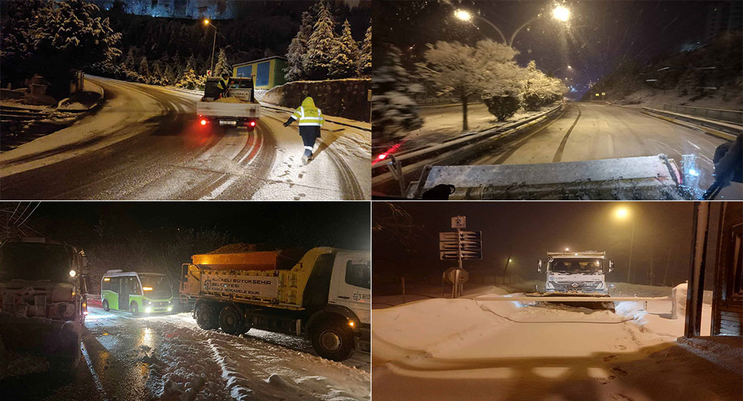 Büyükşehir Karla Mücadele Ekipleri, yollarda buzlanma ve kapanma olmaması için gece yarısından bu yana 24 saat aralıksız çalışıyor