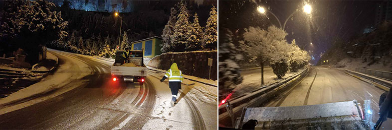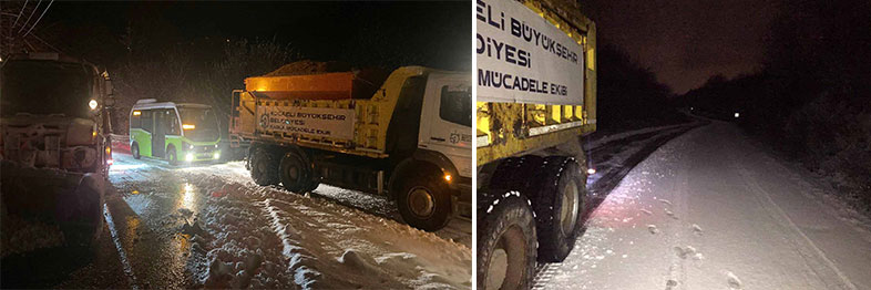 Gece ve gündüz iki ekip halinde nöbet tutan karla mücadele birimleri, yağan karın yolda buzlanma oluşturmaması ve araçların yolda kayarak olumsuz durumlara sebep olmaması için 24 saat kar temizleme ve tuzlama çalışması gerçekleştiriyor. Kartepe; Zirve Yolu, İzmit; Santral Rampası, Umuttepe, Miralay Mümtaz Caddesi, Kuruçeşme TOKİ Akpınar konutları, Gölcük; İrşadiye Eriklitepe yolu, Körfez; Şemsettin-Naip Kalburcu-Belen- Elmacık Radar güzergahı, Başiskele; Aytepe Diriliş Kamp Yolu, Baraj yolu-Cami Düzü-Doğantepe-Serinlik Bağlantı Yolu olmak üzere ihtiyaç duyulan tüm noktalarda yolların açık tutulması, buzlanma olmaması için çalışmalarını sürdürecek.