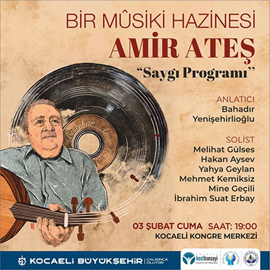 “Bir Musiki Hazinesi: Amir Ateş Özel Programı” 3 Şubat Cuma akşamı Kocaeli Kongre Merkezi’nde 19.00’da başlayacak. Üstat Amir Ateş’in onur konuğu olarak yer alacağı program öncesinde konuklar için Kongre Merkezi fuayesinde kokteyl verilecek. Ardından Akçakoca Salondaki programa geçilecek.