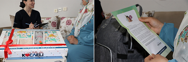 Ayrıca Kocaeli Büyükşehir Belediyesinden sosyal destek alan annelerimize de doğum öncesi hastane çıkış paketi veriliyor. Bu paketin içeriğinde yeni doğan bebeğin ihtiyaçlarına yönelik hastane çıkışı kıyafeti, uzun ve kısa kollu zıbın, müslin bebek battaniyesi, emzirme önlüğü, mama önlüğü, ağız bezi, amigurumi oyuncak hediye ediliyor. Talepler 153 üzerinden alınıyor. Anneler ihtiyaç halinde çağrı merkezi ile birimlere ulaştıklarında bu verilen eğitimler tekrarlanıyor.