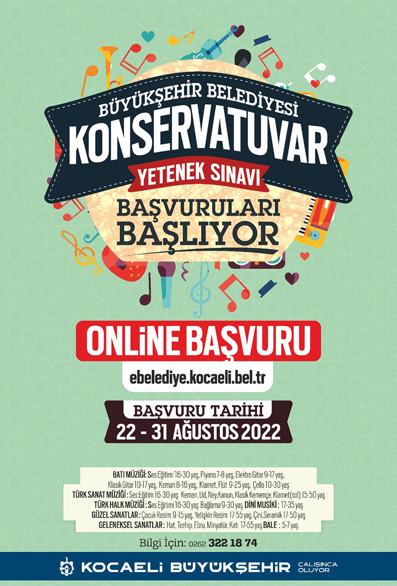 Kocaeli Büyükşehir Belediye Konservatuvarının sınavları ise 3-4 Eylül tarihleri arasında gerçekleştirilecek. Sınavlarda başarılı olan adaylar, kazandıkları bölüm kapsamında, 2 ile 4 yıl arasında sanat eğitimi almaya hak kazanacak.