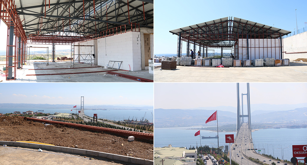 Yılport Ulaştırma Hizmetleri Mesleki ve Teknik Anadolu Lisesi’nin hemen arkasında bulunan 2 bin metrekarelik alana yapılacak seyir terası, Osmangazi Köprüsü ve İzmit Körfezi’ni tepeden görmesi nedeniyle Dilovası’na cazibe katacak. Köprüye nazır seyir terası için ciddi bir çalışma yürüten Büyükşehir, proje alanında modern bir kafeterya inşa ediyor. 300 metrekare alana yapılacak kafeterya binasının çelik montajını ve duvarlarını tamamlayan ekipler, asma tavan karkası ve çatı kaplama imalatına da devam ediyor.