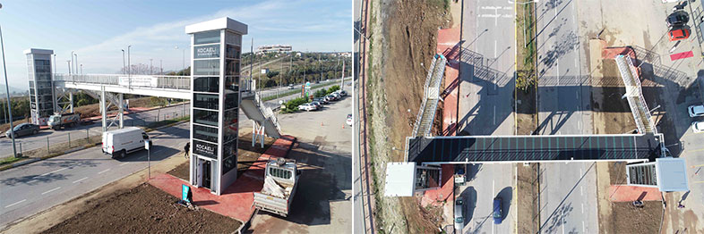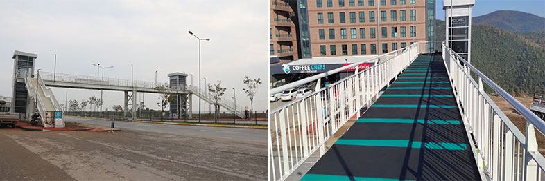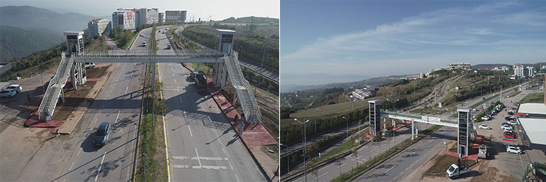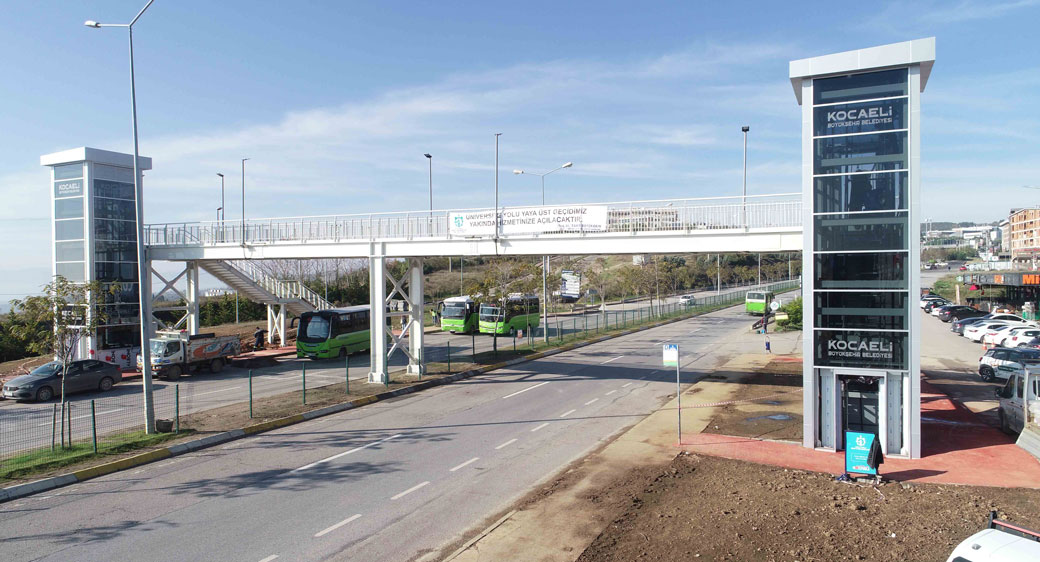 Kocaeli Üniversitesi yurtlar bölgesinde kalan öğrencilerin Prof. Dr. Baki Komsuoğlu Bulvarında bulunan duraklara erişimini güvenli ve kolay bir şekilde sağlayacak çelik yaya üst geçidi, 38 metre uzunlukta 3 metre genişliğinde yapıldı.