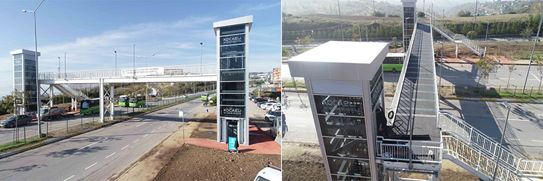 Kabaoğlu Mahallesinde yapımına başlanan üniversite yolu yaya üst geçidinin birçok montaj imalatı tamamlandı. Çalışma kapsamında iki taraftaki asansörlerin kabin montajları devam ederken yaya üst geçidinin ana platform yürüyüş kısmı zeminine asfalt kaplama serildi ve Kocaelispor’un renkleri olan Yeşil-Siyah renklere boyandı. Üst geçidin merdiven basamak kaplamaları kaymaz malzeme olan tartan pistten yapılacak. Çalışma dahilinde üst geçitte 150 metreküp beton, 16 ton demir, 75 ton da çelik kullanıldı.