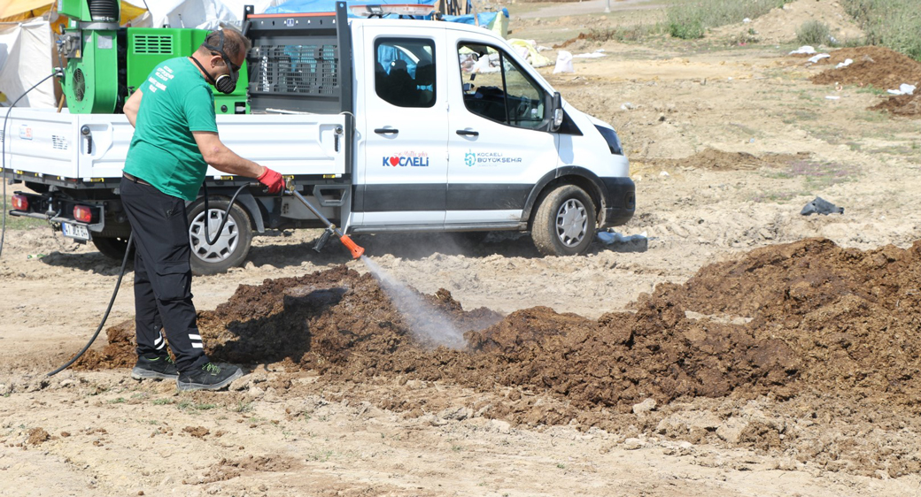 Kocaeli Büyükşehir Belediyesi 6 ilçede kurulan kurban çadırlarında periyodik olarak ilaçlama uygulaması yapıyor