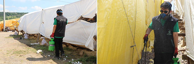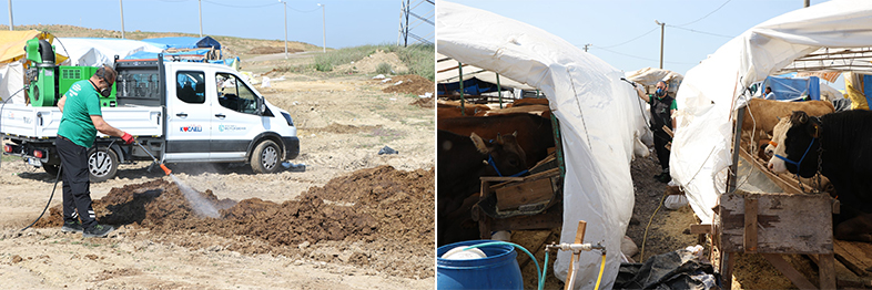 Kocaeli Büyükşehir Belediyesi, Kurban Bayramı öncesinde kurbanlık satış alanlarında sivrisinek, karasinek ve kene gibi haşerelere karşı ilaçlama uygulaması gerçekleştiriyor. Bu sayede başta karasinek olmak üzere vektör özelliği taşıyan canlıların üremesi engellenirken, vatandaşların kurban alım satım işlemlerini de sağlıklı bir ortamda yapmaları sağlanıyor.