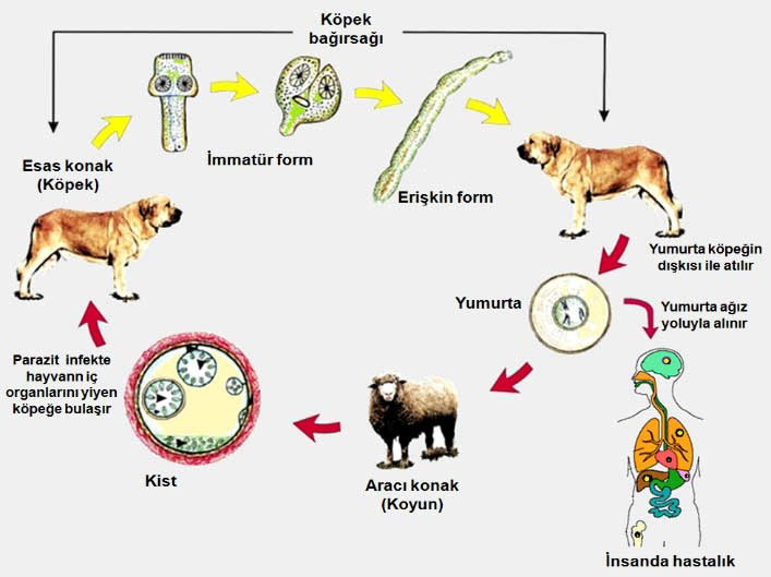 Halk arasında kist hastalığı olarak bilinen bu hastalığın etkeni, “Echinococcus granulosus” adı verilen bir parazittir. Bu parazitin esas kaynağı köpek, kurt, tilki gibi et yiyen hayvanlardır. Ancak, sıklıkla köpeklerdir. Parazit köpeklerin ince bağırsaklarında yaşar. Hastalık köpek dışkısı ile atılan yumurtalar ile insana bulaşır. Köpek dışkısı ile atılan yumurtalar çok dayanıklıdır, toprakta ve soğukta bir yıl kadar canlı kalabilirler. Dışkıyla atılan yumurtalar hayvanların ayakları, arazi eğimi, rüzgar ve yağmurla yayılırlar. Bu kistleri içeren hayvan etleri ve sakatatlar, köpekler tarafından yenince parazit bağırsaklarda olgunlaşır. Parazitlerin belirli aralıklarla yumurtlayarak ana konakçı köpekler tarafından atılmasıyla enfeksiyon zinciri bir kısır döngüye dönüşür.