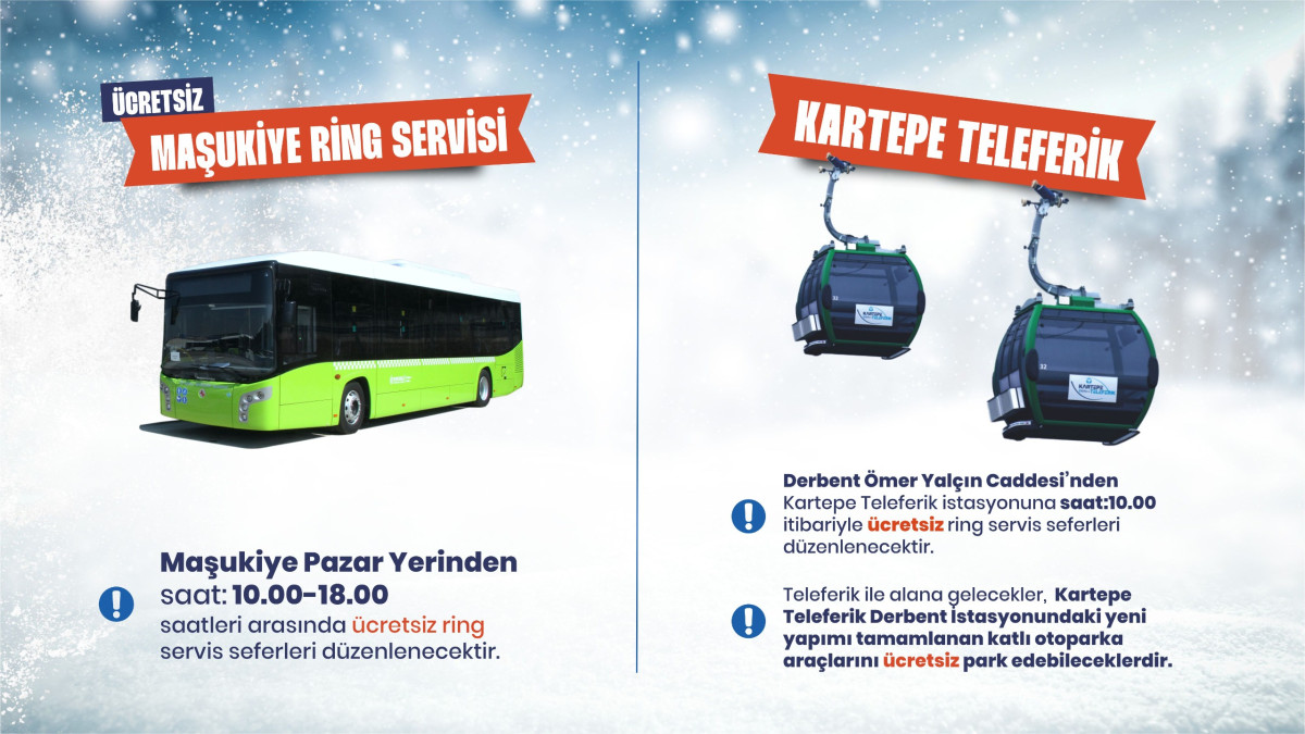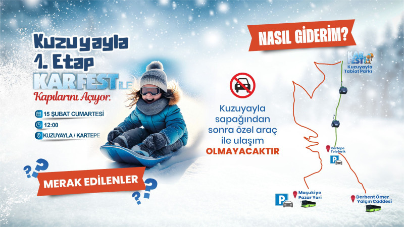 15 Şubat Cumartesi günü Kuzuyayla’da düzenlenecek olan etkinlikte trafik ile ilgili problem yaşamamak ve trafik yükünü azaltmak için de tüm detaylar düşünüldü. Bu kapsamda ulaşım Kartepe Teleferik ile sağlanabileceği gibi Maşukiye Pazar yerinden Kuzuyayla’ya, Derbent Ömer Yalçın Caddesinden Kartepe teleferik İstasyonuna ücretsiz ring servisleri düzenlenecek. Ring servisleri Saat 10:00 itibariyle başlayacak, özel araçlarla festival alanına ulaşım yapılmayacak.