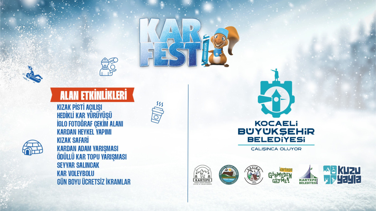 Kocaeli Büyükşehir Belediyesi öncülüğünde organize edilen, vatandaşların soğuk kış günlerinde içlerini ısıtacak olan KARFEST, bu yıl da kış severlere muhteşem bir gün yaşatacak. 15 Şubat Cumartesi günü 12.00 ile 21.00 saatleri arasında Kartepe Kuzuyayla'da düzenlenecek olan KARFEST için tüm hazırlıklar tamamlandı. Kocaeli Büyükşehir Belediyesi, Kartepe Belediyesi ve Kartepe Turizm Derneği, Kartepe Doğal Hayatı Koruma Kültür ve Turizm Derneği, Kartepe Görmeden Gitme Platformu ve Kavibu Derneği işbirliğiyle organize edilecek etkinlikte herkes eğlenceye doyacak.