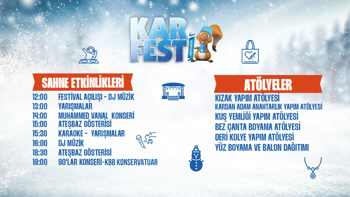 Büyükşehir’in KARFEST festival alanında sadece eğlence değil, öğrenme fırsatları da sunulacak. “Kızak Yapım Atölyesi”, “Kardan Adam Anahtarlık Yapımı”, “Kuş Yemliği Yapımı” ve “Bez Çanta Boyama” etkinlikleriyle katılımcılar hem kendi üretimlerini gerçekleştirmenin mutluluğunu elde edecek hem de çevre dostu çalışmalar ile eğlenceli ve bilinçlendirici bir deneyim yaşayacaklar. Festival alanında ayrıca “Deri Kolye Yapım Atölyesi”, “Çocuklar İçin Yüz Boyama” ve “Balon Dağıtımı” gibi aktiviteler, festival alanında minik misafirlere unutulmaz anlar yaşatacak. Kuzuyayla'nın bembeyaz doğasında bu çeşitlilik, herkesi mest edecek.