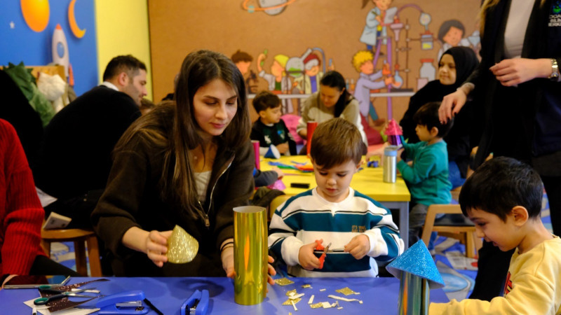 Programın en keyifli bölümlerinden biri olan atölye çalışmaları ise renkli görüntülere sahne oldu. Çocuklar, velileriyle birlikte kendi roket tasarımlarını oluşturarak hayal güçlerini somut ürünlere dönüştürdü. Tasarladıkları roketlerle hem takım çalışmasını deneyimleyen hem de problem çözme becerilerini geliştiren minikler, üretmenin ve başarmanın mutluluğunu yaşadı. Etkinlik, çocukların erken yaşta bilim ve teknolojiyle tanışmasının önemini vurgularken, aynı zamanda ailelerin de sürece aktif katılımını sağlayarak öğrenmenin kalıcı hale gelmesine katkı sundu.