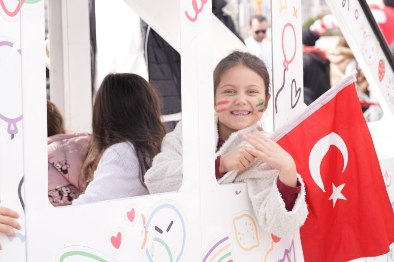 Minik ellerde bayrak, yüzlerde tebessüm;