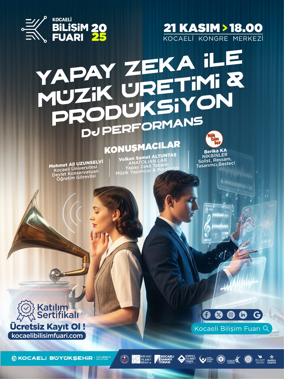 Anadolu müziğini orijinal yorumuyla seslendiren Nikbinler ve Anatolıan Lab, Kocaeli Bilişim Fuarı’nda “Yapay Zeka ile Müzik Üretimi ve Prodüksiyon” adlı oturuma katılacak. Oturum sonrası DJ performansında Nikbinler Grubu’nun solisti Berika Ka sahne alacak.
