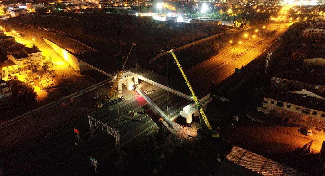 Otoyol köprüsünde kiriş montajı gece yapıldı