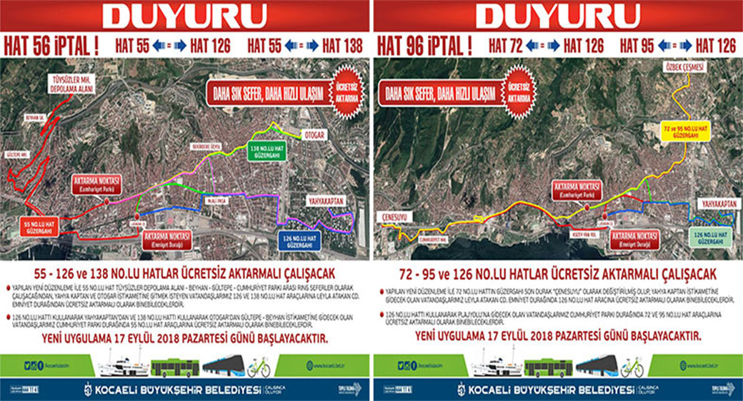 İzmit şehir içi ulaşımında vatandaşlarımızın daha sık seferler ile daha hızlı ulaşımını sağlamaya yönelik olarak, Kocaeli Büyükşehir Belediyesi Toplu Taşıma Dairesi Başkanlığı’nca özel halk otobüsleri nezdinde ücretsiz aktarmalı uygulama başlıyor. Bu uygulama kapsamında; 56 NO.LU GÜLTEPE – YAHYA KAPTAN hattı iptal edildi. Bunun yerine 55 - 126 ve 138 No.lu hatlar ücretsiz aktarmalı olarak çalışacak.