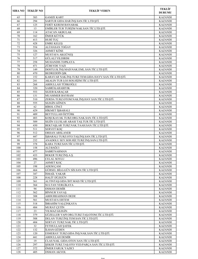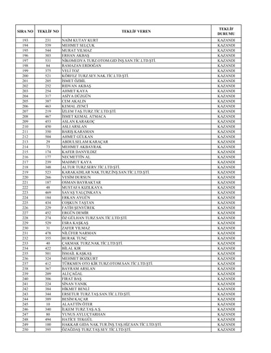Alfabetik sıraya göre ön kura çekimi yapıldı. 1. sırada, Hakkar Gıda Nak.Tur.İnş.Taş.Hiz.San.Tic.Ltd.Şti. olurken diğer sıralama Hatice Tekgül, Özağdaş Turz.Taş.Sey.Tic.Ltd.Şti. , Reverans Turz.San.Tic.Ltd.Şti. şeklinde oluştu. Yapılan kura çekimi sonucunda, 361.000,00-TL+KDV teklifiyle Hatice Tekgül 248, Hakkar Gıda Nak.Tur.İnş.Taş.Hiz.San.Tic.Ltd.Şti. 249, Özağdaş Turz.Taş.Sey.Tic.Ltd.Şti. 250 sırada P Plaka hakkı kazandı. İşletme kurada boş çektiğinden Reverans Turz.San.Tic.Ltd.Şti. 251. sırada kalarak P plaka hakkı kazanamadı.
