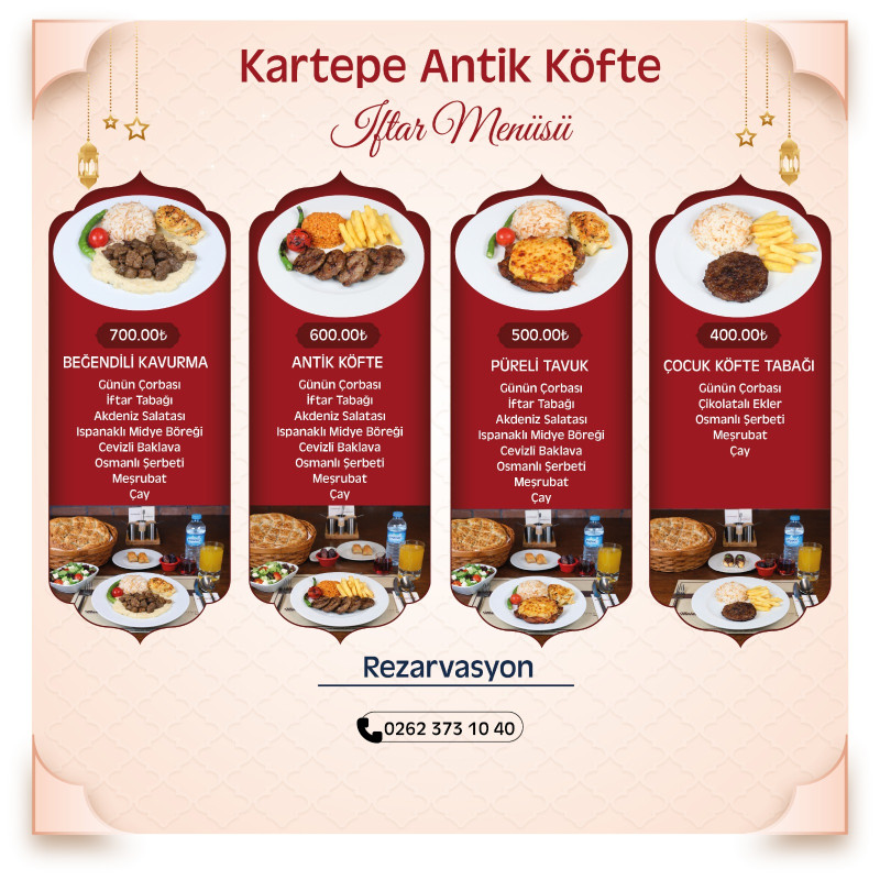 Kocaeli Büyükşehir Belediyesi iştiraki Antikkapı A.Ş., birbirinden leziz yemeklerinin yer aldığı zengin menüleriyle Ramazan ayı boyunca vatandaşlara hizmet verecek. Antikkapı’nın iftar menüsü; çorba, iftar tabağı, salata, ana yemek, tatlı, Osmanlı şerbeti, meşrubat ve çay ikramının yer aldığı zengin bir içerikten oluşuyor. Ramazan ayı boyunca kaliteli hizmet anlayışı ve titizlikle uygulanan hijyen standartlarıyla gerçekleştirilecek iftar programlarında yoğunluk yaşanmaması ve misafirlerin konforlu bir ortamda ağırlanabilmesi için rezervasyonların önceden yapılması önem taşıyor.