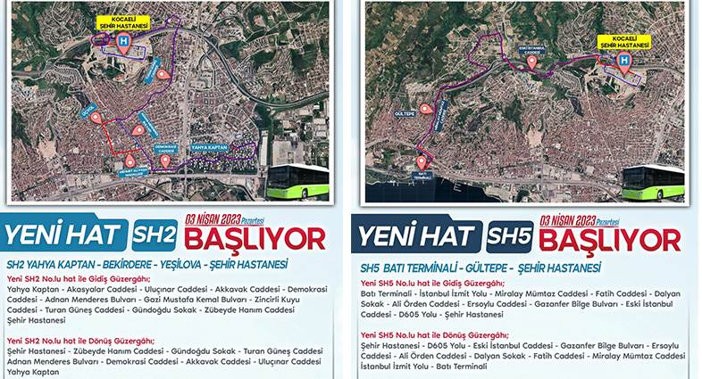 İzmit Yahya Kaptan Mah.-Yenişehir Mah.- Mehmet Ali Paşa Mah.- Bekirdere Mah.-Tavşantepe Mah. - Yeşilova Mahallesi – Şehir Hastanesi. SH2 hattı ile Yeşilova, Tavşantepe, Şirinevler, Bekirdere bölgelerinin Yahya Kaptan Mahallesi ile entegrasyonu sağlanarak, Yahya Kaptan Mahallesindeki okullarda eğitim öğretim görmekte olan öğrencilerin tek vasıta ile toplu taşıma hizmeti sağlanmış olacak.