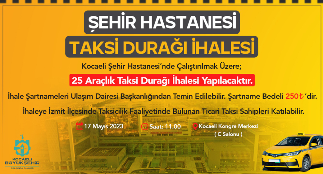 Kocaeli Büyükşehir Belediyesi, hasta kabulüne başlayan Kocaeli Şehir Hastanesi için 25 araçlık taksi durağı ihalesi düzenleyecek. İhale 17 Mayıs tarihinde Kocaeli Kongre Merkezi C Salonunda yapılacak.