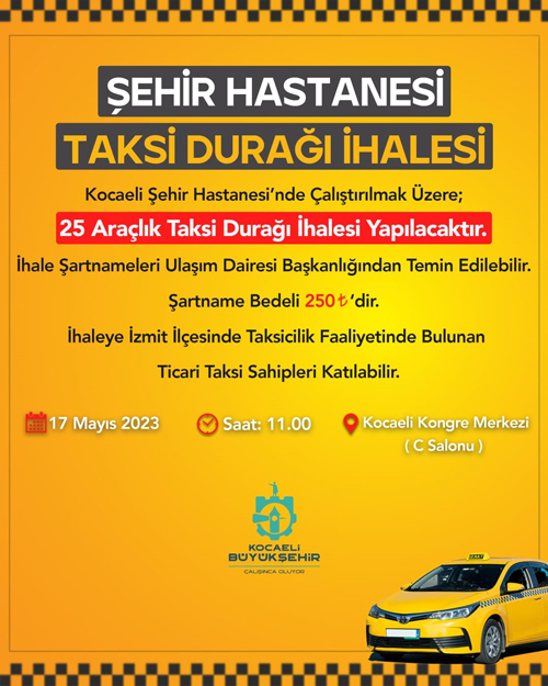 17 Mayıs tarihinde Kocaeli Kongre Merkezi C Salonunda gerçekleştirilecek ihale 25 araçlık olacak. İzmit İlçesi Şehir hastanesinde çalıştırılacak taksi durağı ihalesine İzmit ilçesinde faaliyet gösteren taksi sahipleri katılabilecek. İhale şartnameleri 08 Mayıs Pazartesi günü itibariyle Ulaşım Dairesi Başkanlığından alınabilecek.