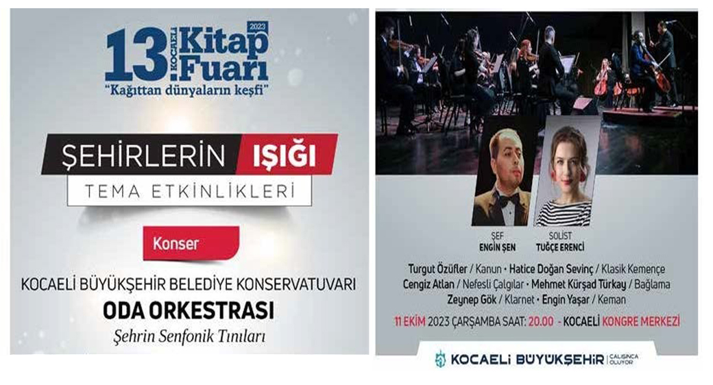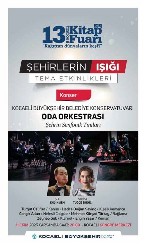 Kocaeli Büyükşehir Belediye Konservatuvarı Oda Orkestrası, 13. Kocaeli Kitap Fuarı’ndaki “Şehirlerin Işığı” etkinlikleri kapsamında sahne alacak. Kentin marka değeri haline gelen orkestra, 11 Ekim Çarşamba akşamı (bu akşam) bir konser verecek. Kitap Fuarı’nın düzenlendiği Kocaeli Kongre Merkezi’nde gerçekleştirilecek olan konser saat 20.00’de başlayacak.