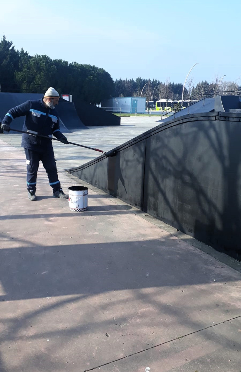 Sekapark’taki Skate Park’ta gerçekleştirilen çalışmalar kapsamında kayma modüllerindeki kaplama malzemeleri yenilenirken, ara derz açıklıkları macun ile kapatıldı. Yüzey dayanıklılığını artırmak amacıyla aşınma direnci yüksek son kat boya uygulaması yapılarak parkur daha güvenli ve konforlu hale getirildi. Yapılan iyileştirmelerle birlikte parkur, hem profesyonel kullanıcılara hem de yeni başlayanlara daha uygun ve güvenli bir sürüş alanı sunuyor.
