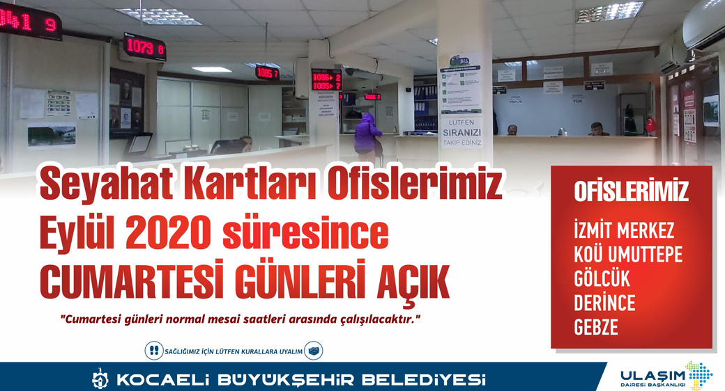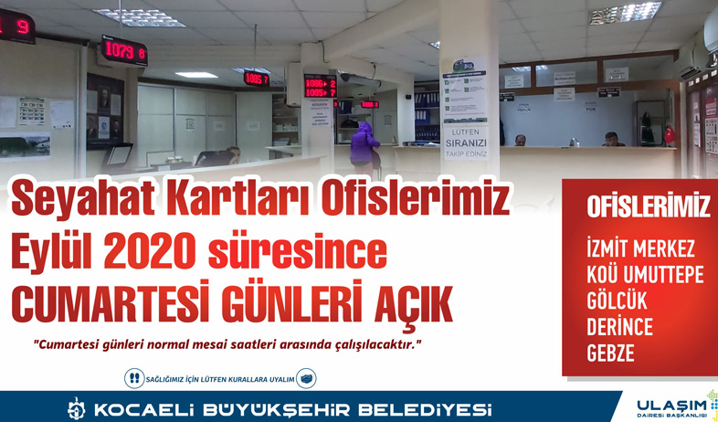 Kocaeli genelindeki beş seyahat kartları ofisi, Ulaşım Dairesi Başkanlığı bünyesinde vatandaşların kart işlemleri için hizmet veriyor. Kocaeli genelinde İzmit Merkez, İzmit Umuttepe (Kocaeli Üniversitesi), Gölcük, Derince ve Gebze Merkez, Seyahat Kartları Ofisleri hafta içi günlerinde vatandaşların kart işlemlerini gerçekleştiriyor. Okulların açıldığı Eylül ayında vatandaşların yoğunluk yaşamadan işlemlerini yapabilmesi için bu beş ofis, Cumartesi günleri de normal mesai zamanı olan 08.30 – 17.30 saatleri arasında hizmet verecek.